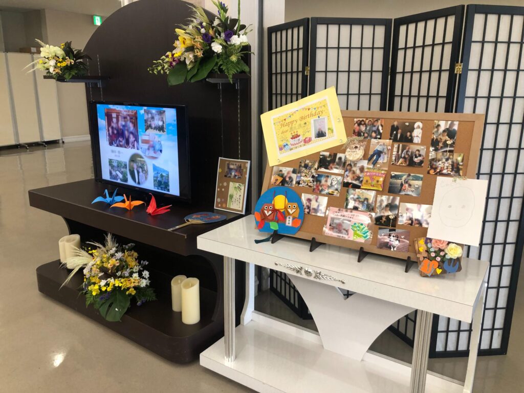 ボードには、お孫さんが描かれた可愛らしい故人様の似顔絵を中心に、たくさんの写真と思い出が飾られ、式場はまるで故人様との時間がよみがえったかのような、温かな空間となりました。