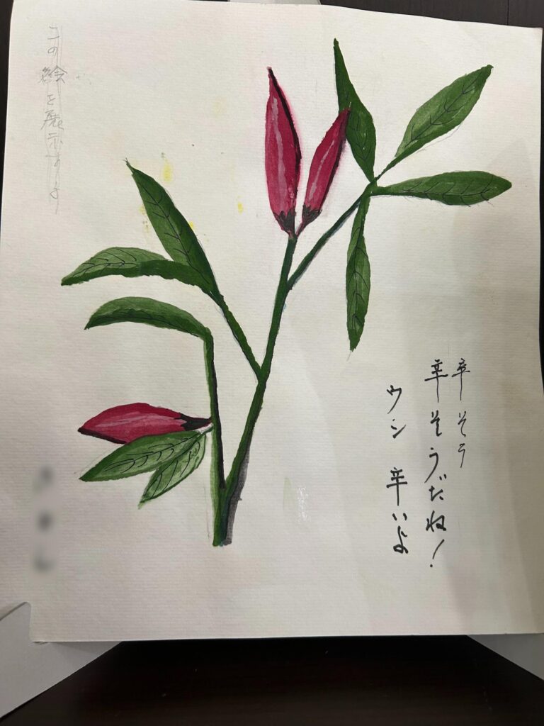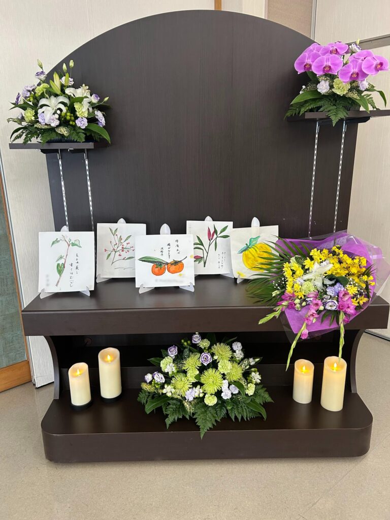 式の中で特に印象深かったのは、故人様が老人ホームで描かれた絵の展示です。受付前に、季節の生花とともにその作品を飾り、ご参列の皆様にご覧いただけるようご提案いたしました。作品には温かみのある色使いと共に、ご本人が綴られたコメントも添えられており、それらを目にしたご家族様からは「厳格な父親でありながら、心の奥底は素朴で優しい人柄が垣間見える」とのお言葉があり、「ぜひ展示してほしい」とのお気持ちをいただきました。
