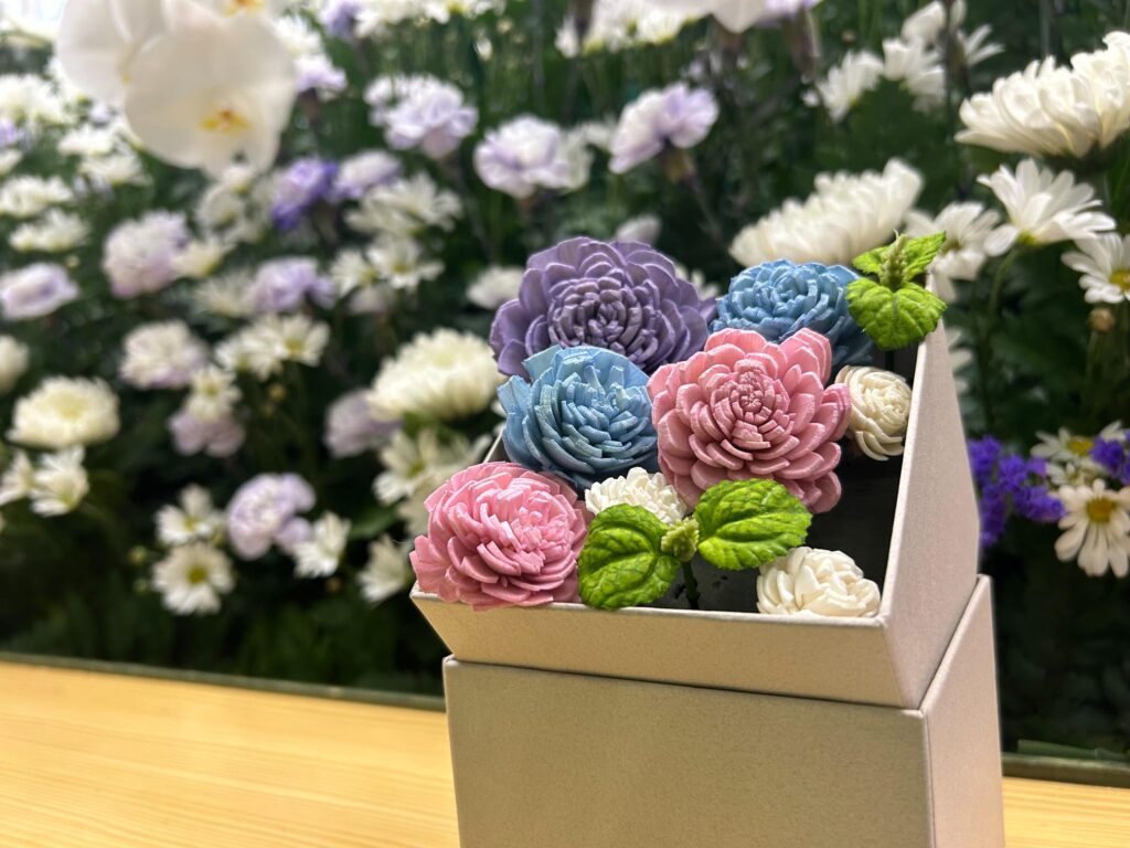 また、ご家族様が手作りされた「KAGURU(カグル)」は、祭壇の一部として飾られました。KAGURUは、ソラの木の皮を使って作られた天然素材のアートフラワーで、枯れないお花としていつまでも形に残り、お持ち帰りいただいた方々がご自宅の仏壇に飾ることができる心のこもったお供え物です。「祭壇にはたくさんの花があるけれど、いつまでも残るお花は嬉しいですね」と、ご参列の方々にも喜んでいただきました。