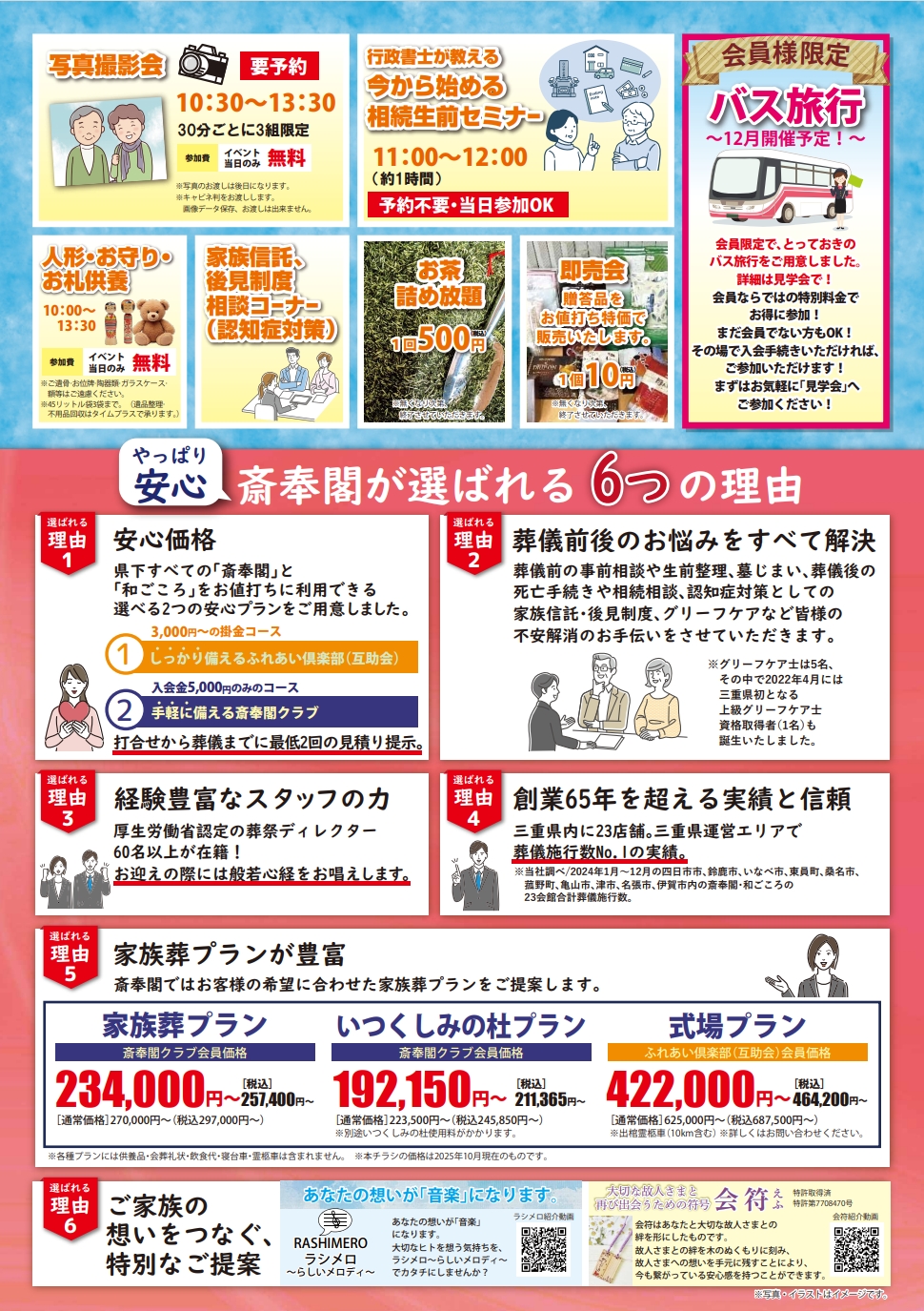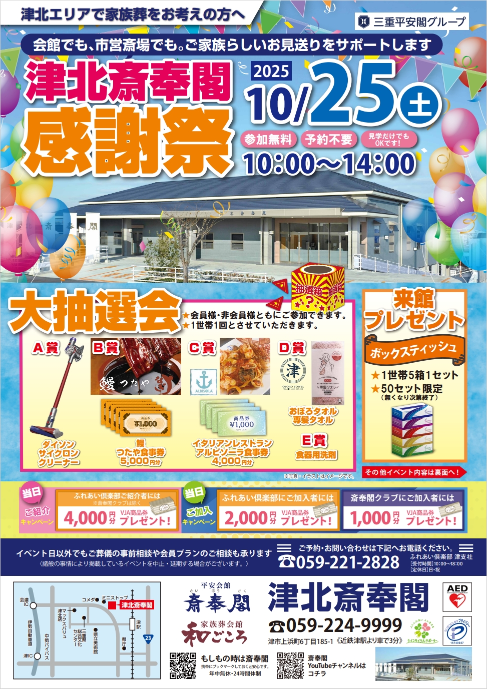 下記日程で家族葬相談会ならびに津北斎奉閣感謝祭を開催いたします。