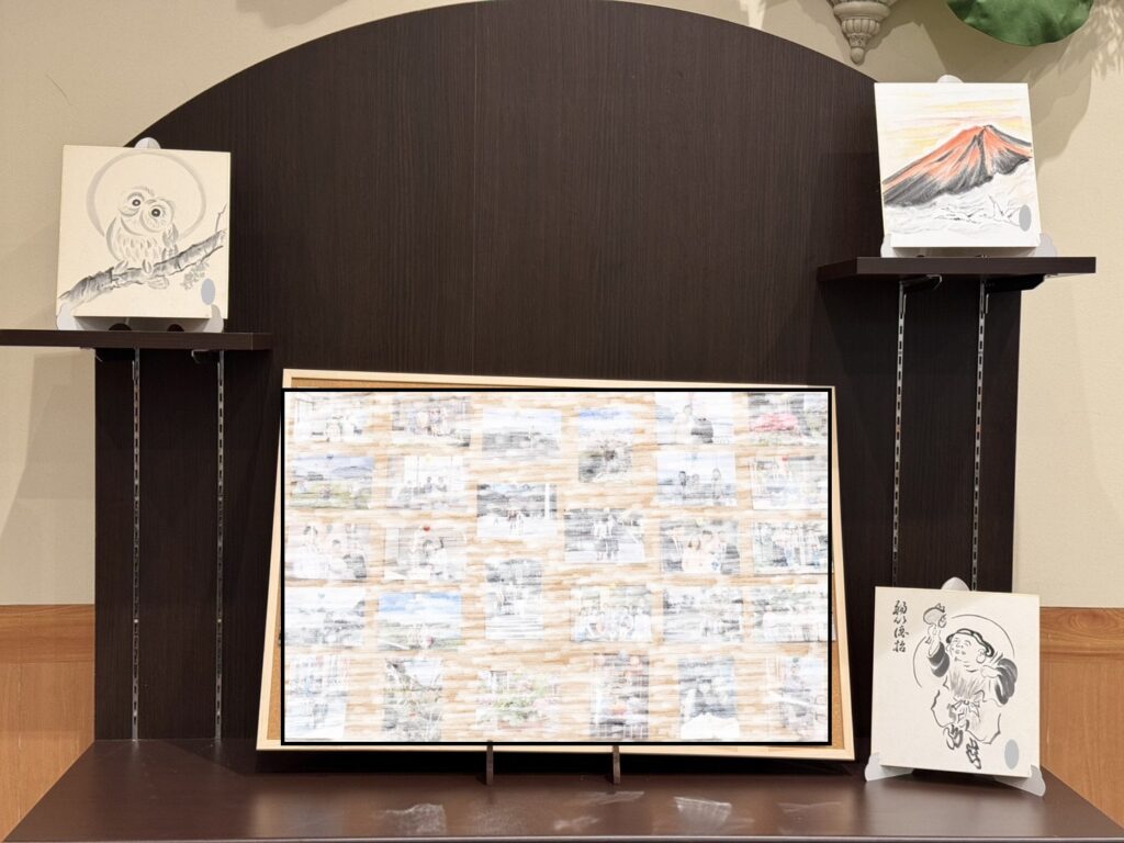 また、施設でいつも飾っていたご家族との写真や、お花の写真、そして故人様が描かれた墨絵も飾りたいとのご希望がありましたので、コルクボードをご用意し、自由に装飾していただきました。仕上がった展示には、墨絵の作品が優しく彩られ、参列者の皆様の目を楽しませていて、ご家族様が「色んな人に見てもらえて嬉しい」と微笑まれていたのが印象的でした。