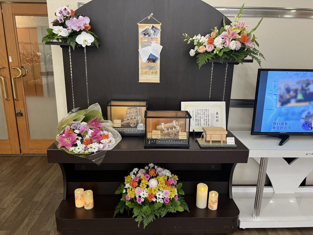 式場には、故人様の生き方を感じられるよう、ボランティア活動の写真や、手作りの作品を展示し、ご家族の想いが詰まった空間となるよう心がけました。展示をご覧になったご家族様は静かに頷きながら、時折微笑まれ、故人様との想い出に浸っておられるご様子が印象に残っています。
