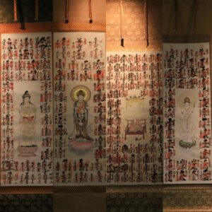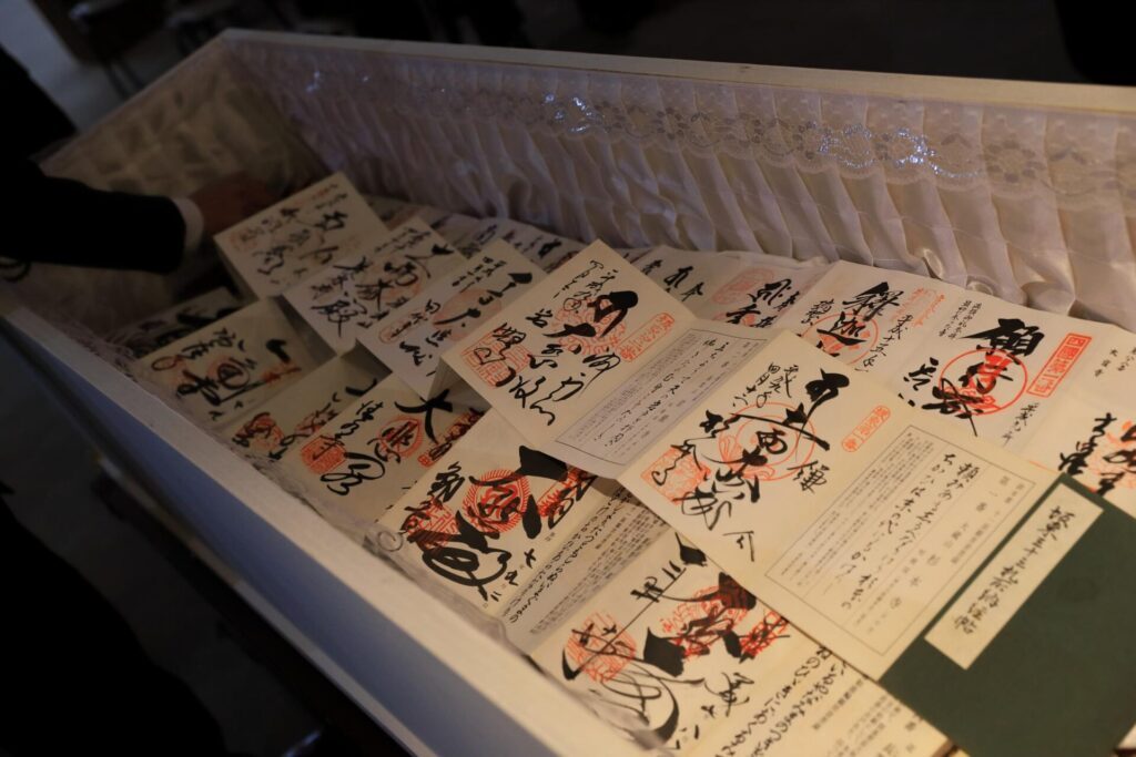 式場祭壇の両脇には、各霊場で受けた納経と朱印が記された2mに及ぶ納経軸がずらりと並びまさに圧巻の一言でした。使い込まれた金剛杖や白衣の展示をご覧になられた皆様が「すごい…」と感嘆の声を漏らされて、まるで故人様の歩みを追体験するかのような思い出をたどる展示となりました。