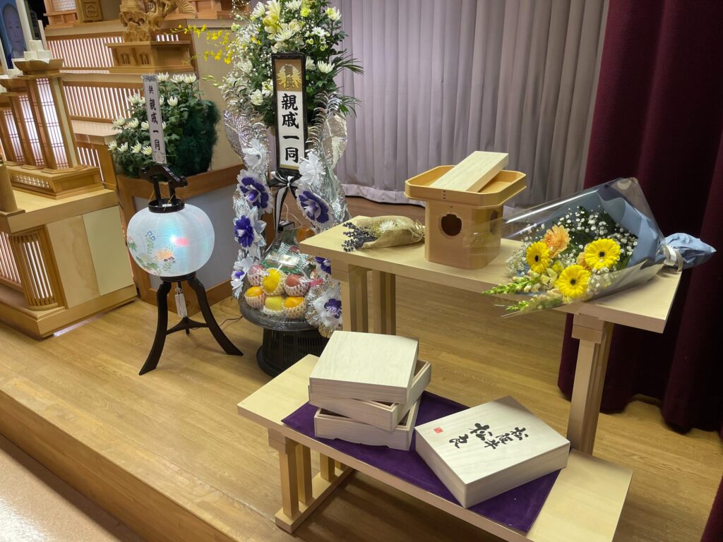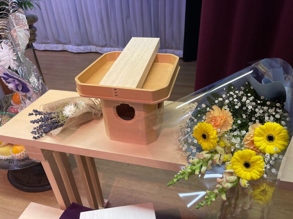 通夜に先立ち、祭壇の横には、故人様が「木箱‐中川」として生前手がけられていた木箱を展示させていただきました。
