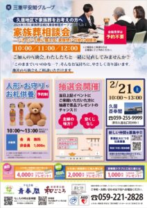 2月21日(土)、久居斎奉閣にて家族葬相談会を中心とした各種イベントを開催いたします。