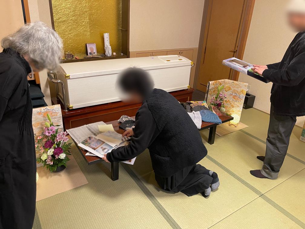 また、故人様のお写真をお持ちになる予定があり、それを大切に飾れるスペースを作りたいとのご要望もありました。そこで私からは、和室の落ち着いた空間を活かし、故人様の前にお写真や思い出の品を並べた「思い出スペース」を設けてはどうかとご提案しました。すでに棺の中には編み物用の棒をお納めされていましたが、「編み物にまつわる品々も一緒に並べることで、より故人様らしさが伝わるのではないか」とお話ししました。