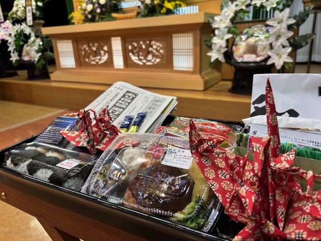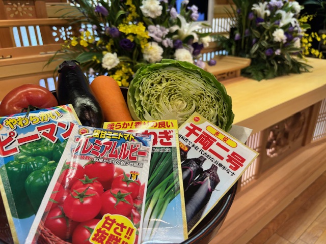 式場には、季節の野菜や種袋、故人様が好きだった物が供えられ、故人様への感謝の気持ちが表れていました。きっと今日も腕を組みながら、静かに皆様を見守っておられたことと思います。