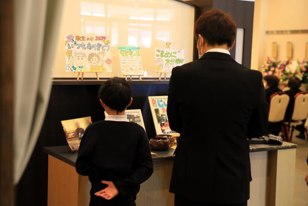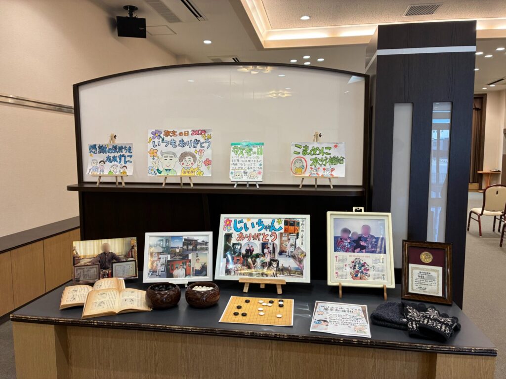 メモリアルコーナー(思い出のコーナー)を設けたことで、碁のほかにもバレーボールやテニス、登山を好まれていたことが分かり、昔のお写真に記された日付をきっかけに当時の記憶がよみがえり、たくさんの思い出話を伺うことができました。また、これまで誰も気づかなかったお孫様のイラストに込められた細やかな描写にも気づくことができ、改めてメモリアルコーナーの意義を感じるひとときとなりました。