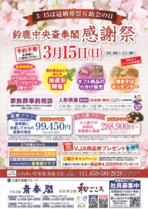3/15の「冠婚葬祭互助会の日」を記念した、鈴鹿中央斎奉閣感謝祭のご案内です。